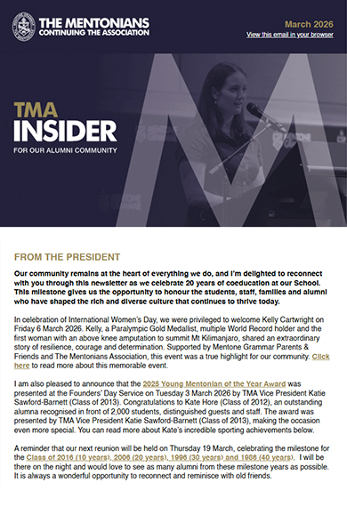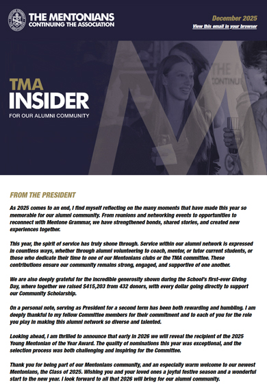 Our regular newsletters are specifically designed for our alumni to keep you informed of key events, latest news and activities from fellow Mentonians including our Mentonians sporting clubs.